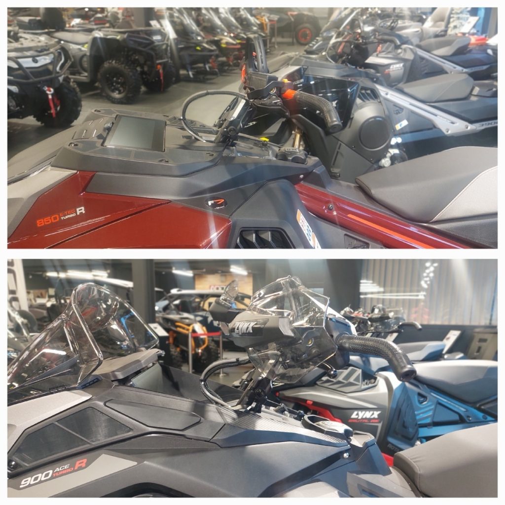 А ветрового стекла нет вообще — потому что в горах оно только мешает, собирая под собой снег. Да и горный райдер чаще всего стоит, глядя на панель сверху вниз, так что защита от ветра тут ни к чему.